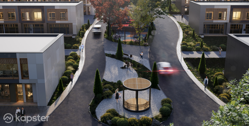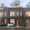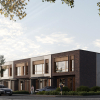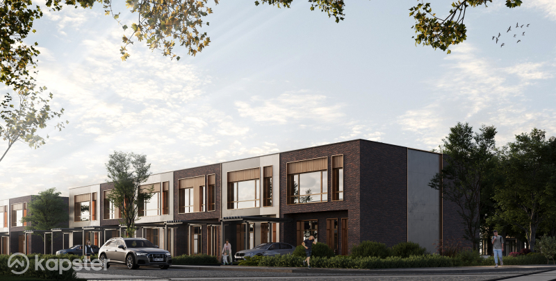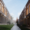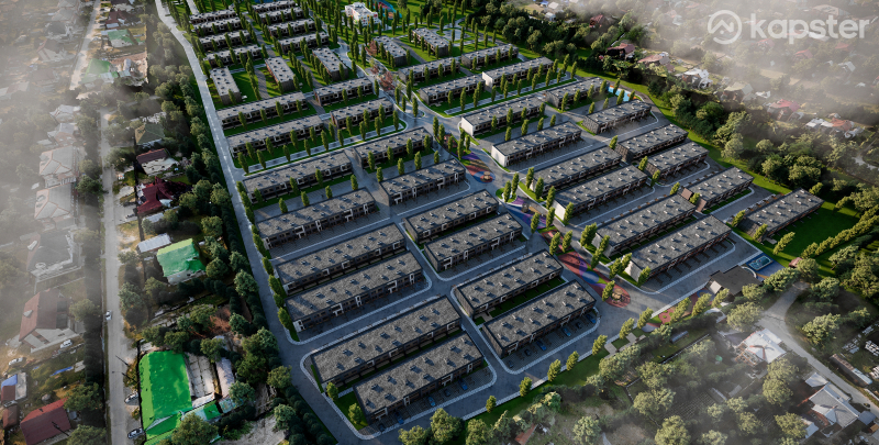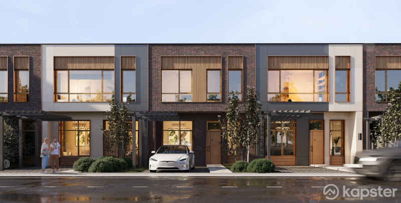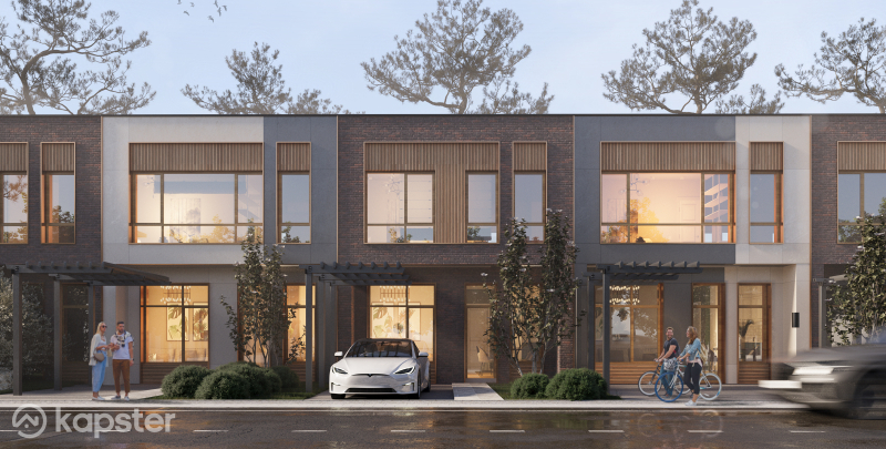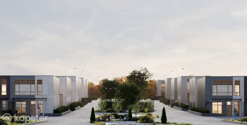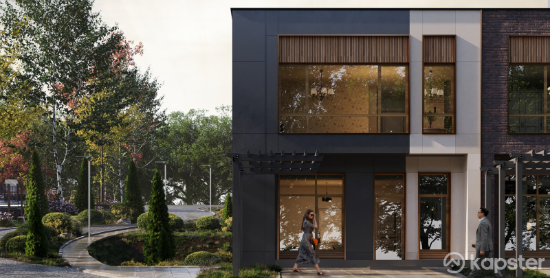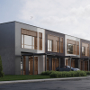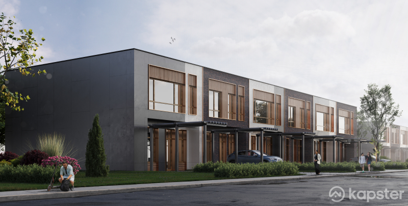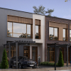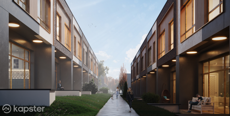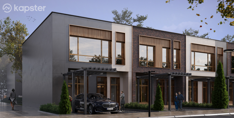 Таунхаусы имеют экологичные фасады из натуральных материалов и инновационных композитов, с элементами озеленения и большими панорамными окнами.