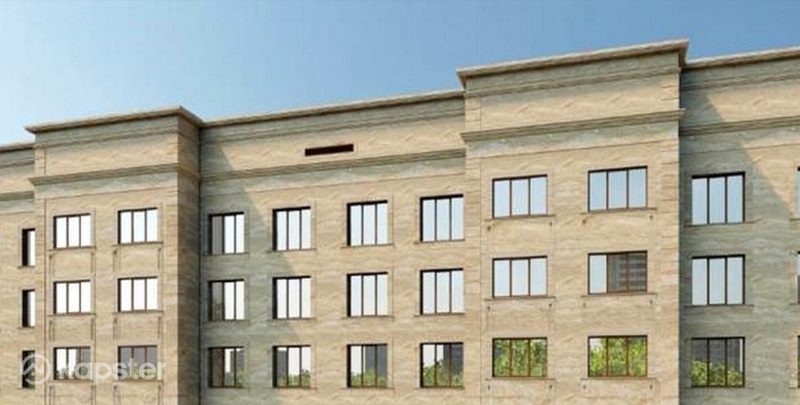 Облицовка фасада выполняется травертином и гранитом. Новостройка оформляется в сдержанном сером и бежевом цвете, ее фасад украшают карнизы и панорамные окна.