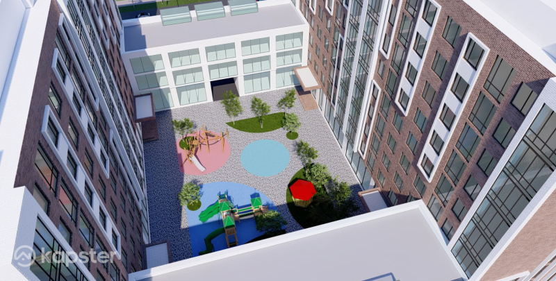 Внутренний двор оборудован игровыми площадками и спортивной зоной на свежем воздухе, создавая безопасную среду для семей с детьми. Зоны отдыха с уютными скамейками приглашают жильцов насладиться атмосферой отдыха и общения.