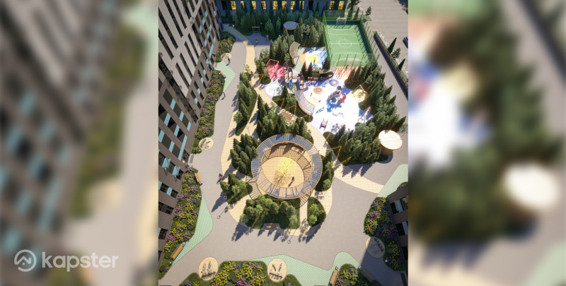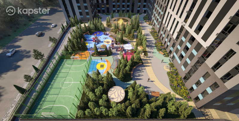 Внутренний двор сочетает эстетическую целостность с уютными зонами для отдыха, включая беседки, футбольное поле, детскую и спортивную площадку. Это идеальное место для семейного отдыха и активного времяпровождения.